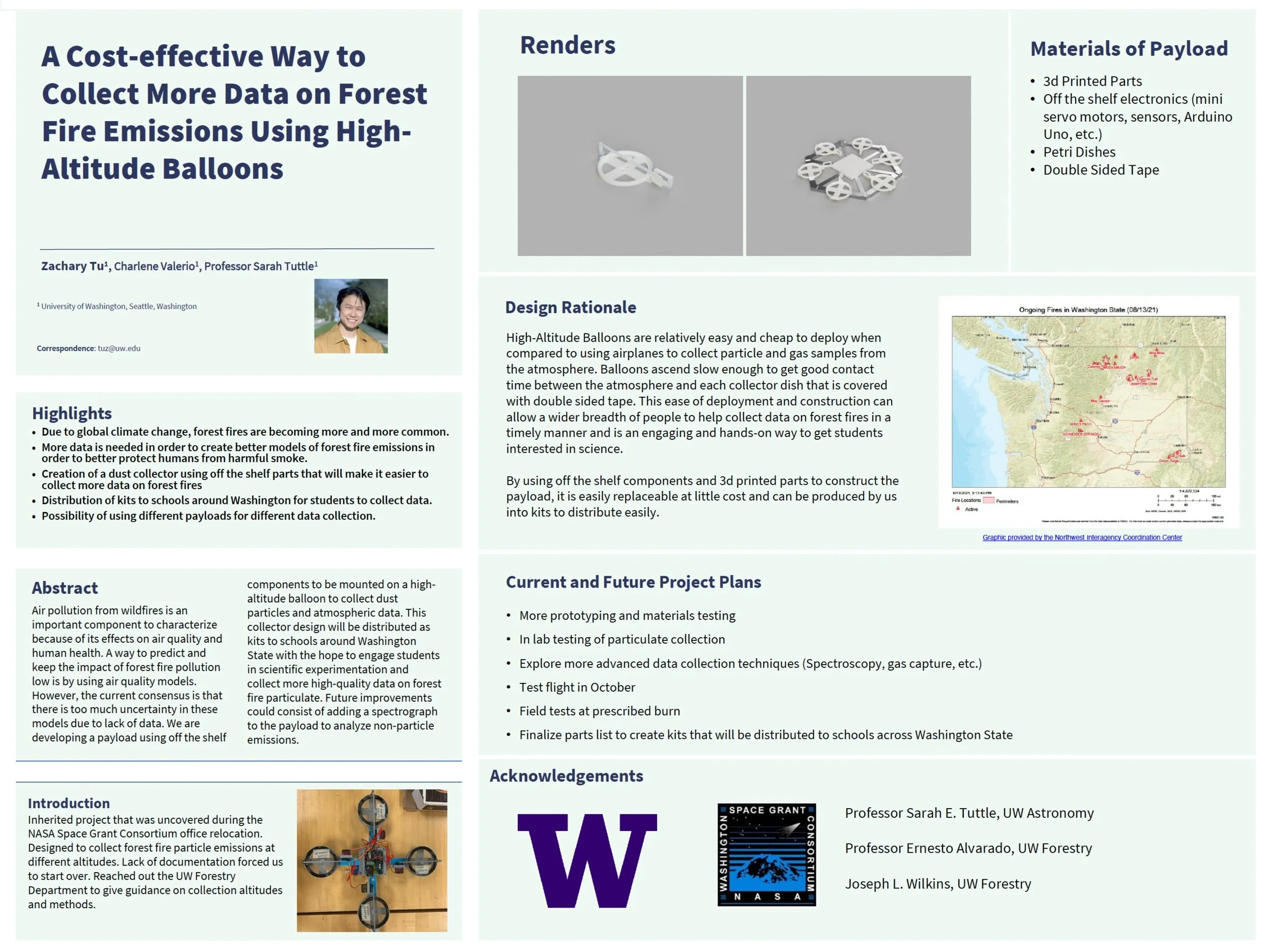The program began in late June and my project was to improve on a forest fire dust collector that is supposed to be mounted on a high-altitude balloon, more in the Forestry domain than Physics or Astronomy. I needed to learn some new things pretty quickly, mainly about the physics of forest fire particulate dispersion, using CAD software, etc. Overall, things went smoothly and I was just happy to be able to work in person. Two other undergraduate students were involved, working on different projects but we were encouraged to collaborate. It felt really good to break the monotony of class and be able to work on something hands on that is different from my majors.